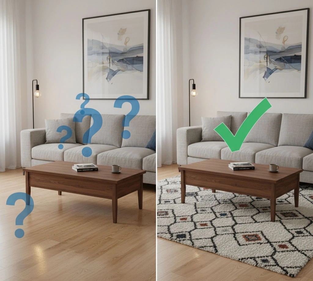 One of the most common design mistakes is choosing rugs that don’t fit the space properly.